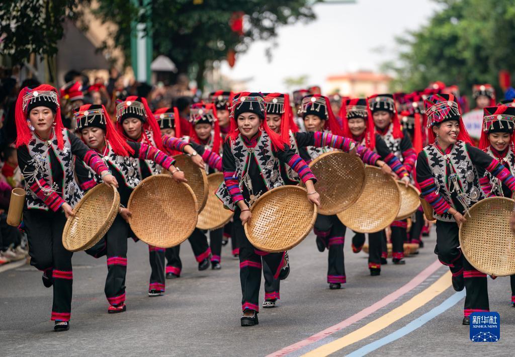 11月19日,绿春县哈尼族群众参加哈尼长街古宴巡游展演。