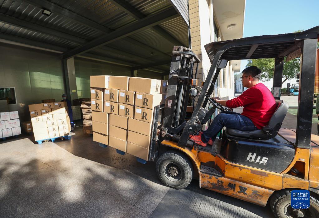 11月21日,在诸暨市店口镇的一家炒货企业内,工作人员把打包好的炒货装车。