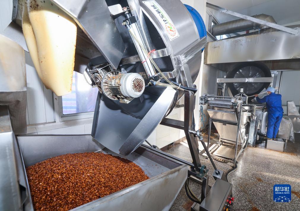 11月21日,在诸暨市店口镇的一家食品有限公司车间内,工作人员在流水线上加工炒货。