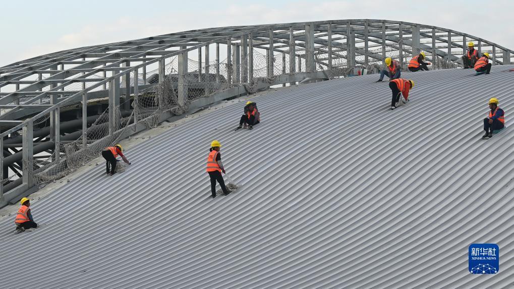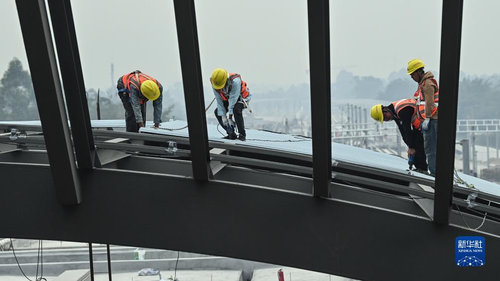 中铁十一局的工人在铺设玉林北站站房的金属屋面(11月22日摄)。