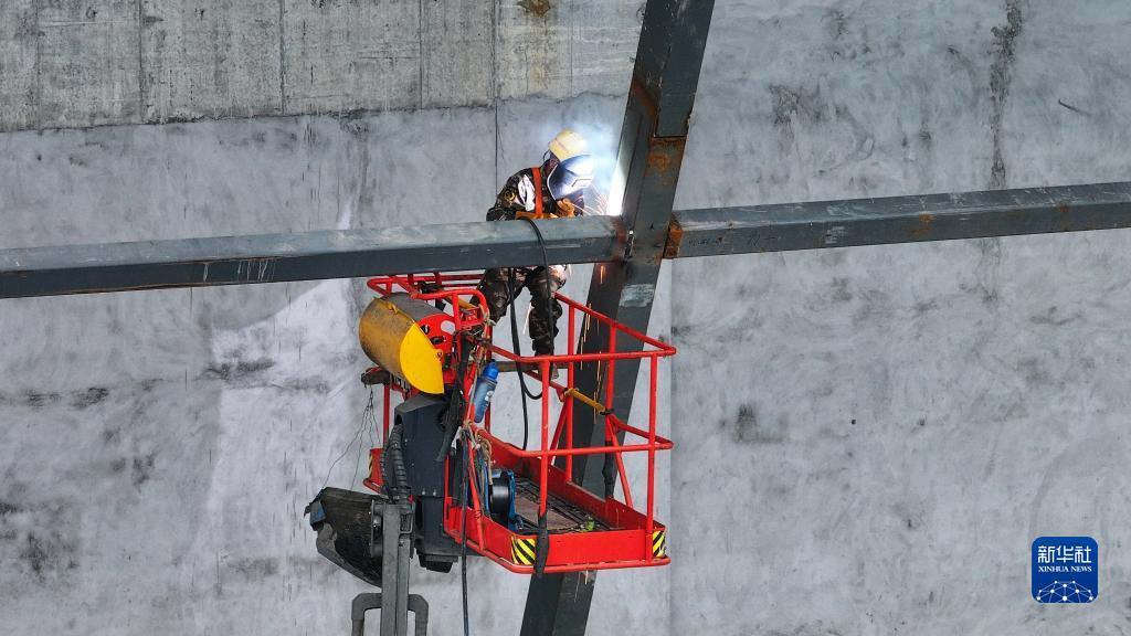 中铁十一局的工人在焊接玉林北站站房的钢梁(11月22日摄,无人机照片)。