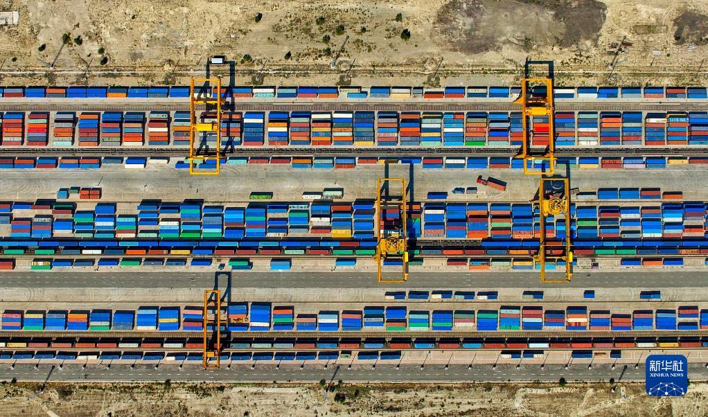 新疆霍尔果斯站换装库(9月6日摄,无人机照片)。目前,经霍尔果斯铁路口岸通行中欧(中亚)班列数量累计超过3.2万列,班列开行线路累计达80条,辐射境外18个国家、45个城市和地区。