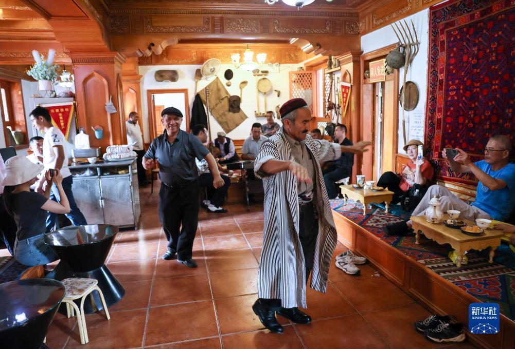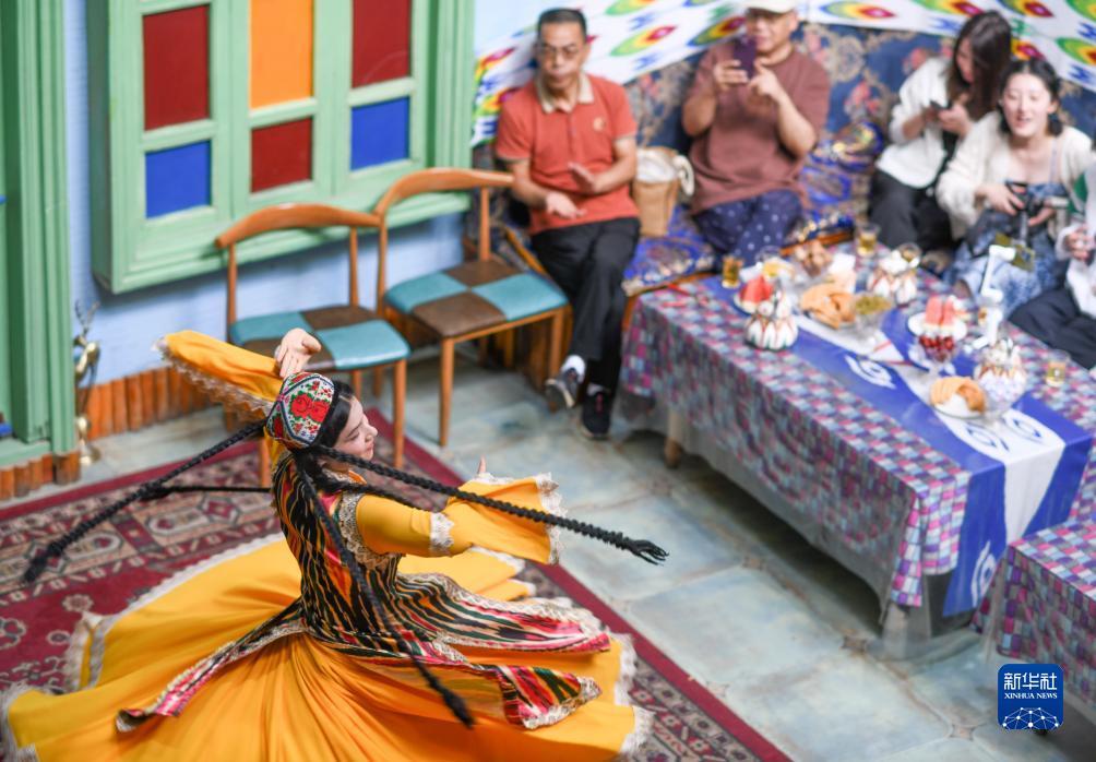 新疆喀什古城景区“古丽的家”旅游家访点,演员随音乐起舞(9月7日摄)。