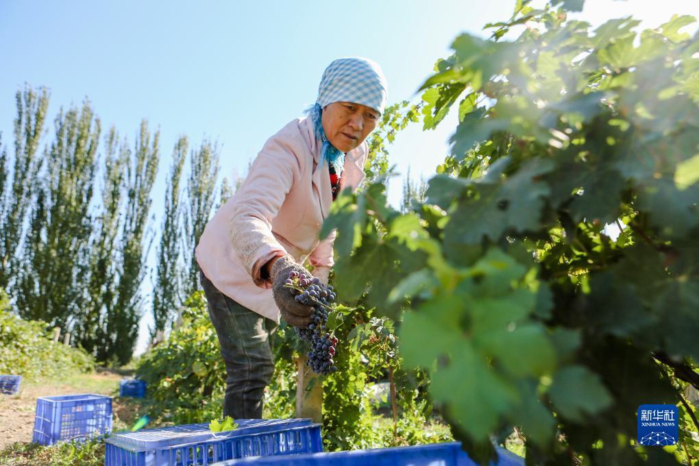 新疆吐鲁番市鄯善县,工人在采摘酿酒葡萄(9月26日摄)。