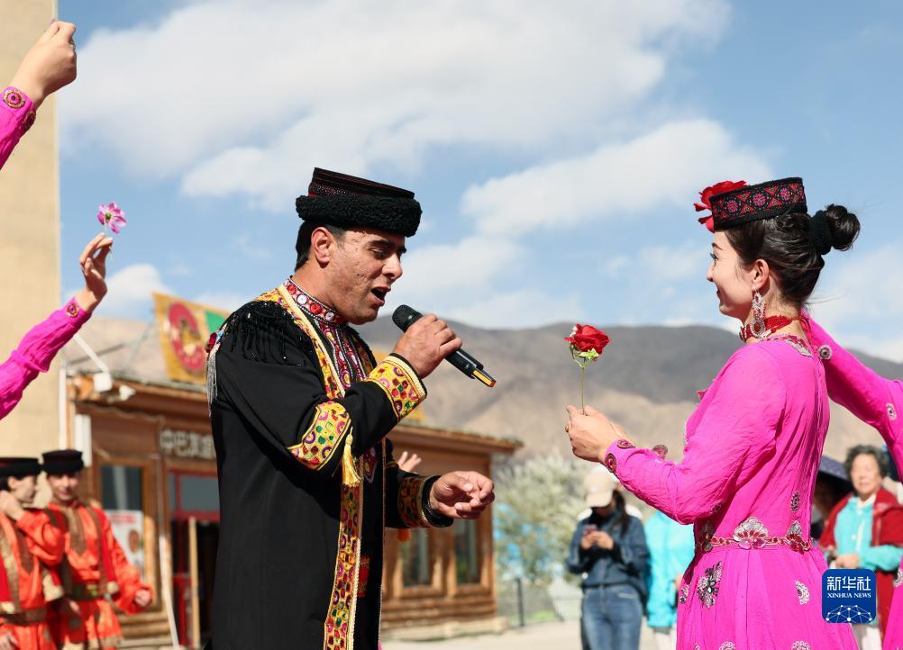 新疆塔什库尔干塔吉克自治县,塔县文工团的拜合提亚尔·居马汗为游客演唱《花儿为什么这样红》,妻子古丽巴努尔·库尔恰克在一旁伴舞(9月4日摄)。