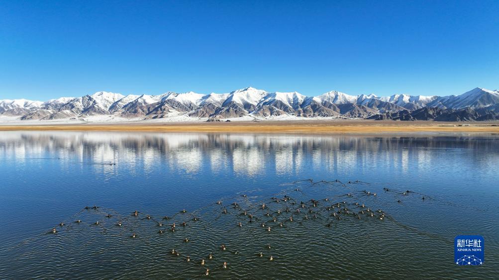 阿尔金山国家级自然保护区,针尾鸭等水鸟在依协克帕提湖栖息(10月18日摄,无人机照片)。