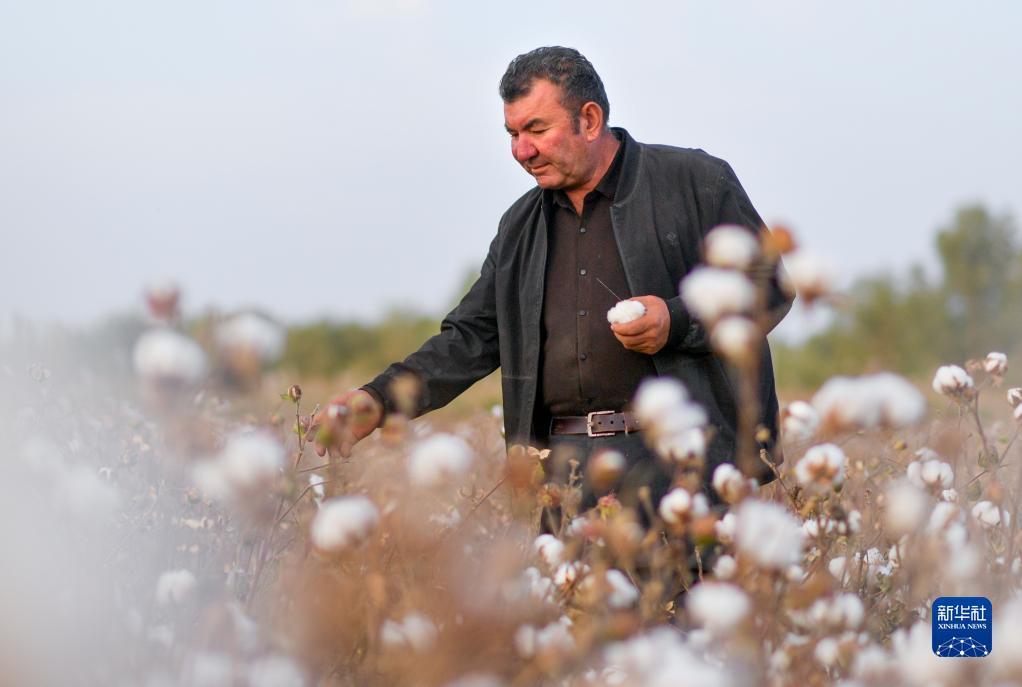 新疆尉犁县巴西买里村,棉农尔肯·热衣木在自家棉田中查看棉花(10月20日摄)。