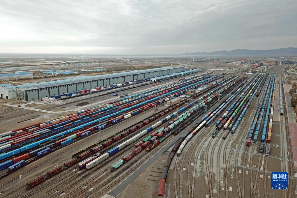 新疆阿拉山口站编组场内集结待发的货运列车(11月4日摄,无人机照片)。阿拉山口口岸位于新疆博尔塔拉蒙古自治州,毗邻哈萨克斯坦,是中国连通中亚、直达欧洲的主要运输通道,在丝绸之路经济带核心区建设中发挥了重要作用。