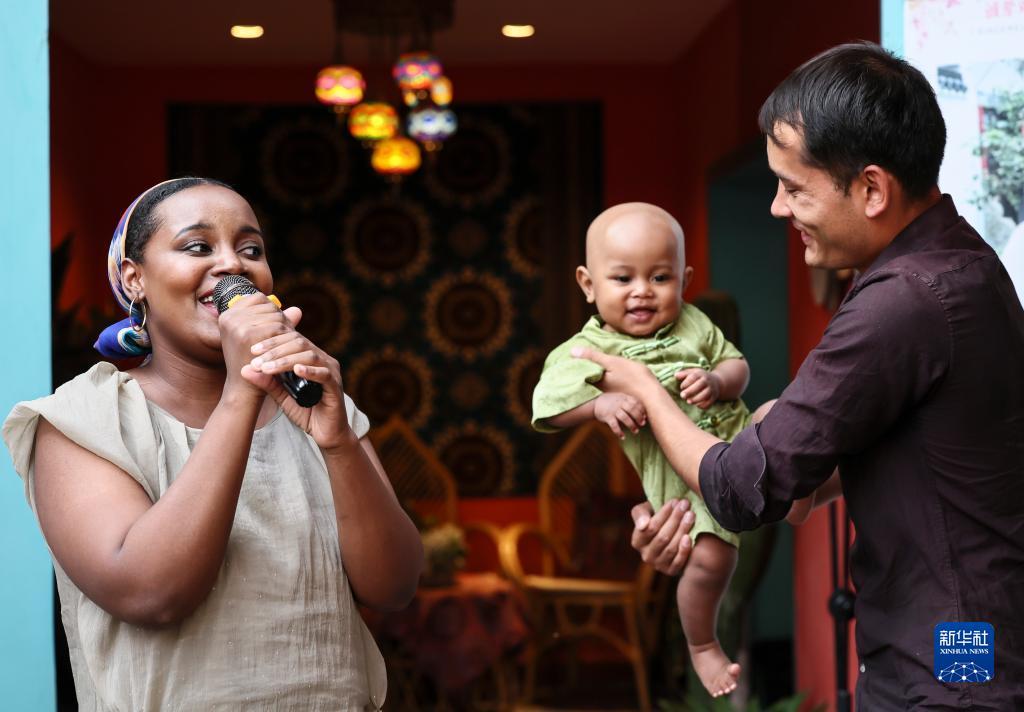 新疆喀什古城“迪力和迪雅”咖啡馆前,坦桑尼亚姑娘海迪雅为游客演唱,她的丈夫喀什小伙迪力夏提·吐尔逊抱着孩子与妻子互动(9月7日摄)。