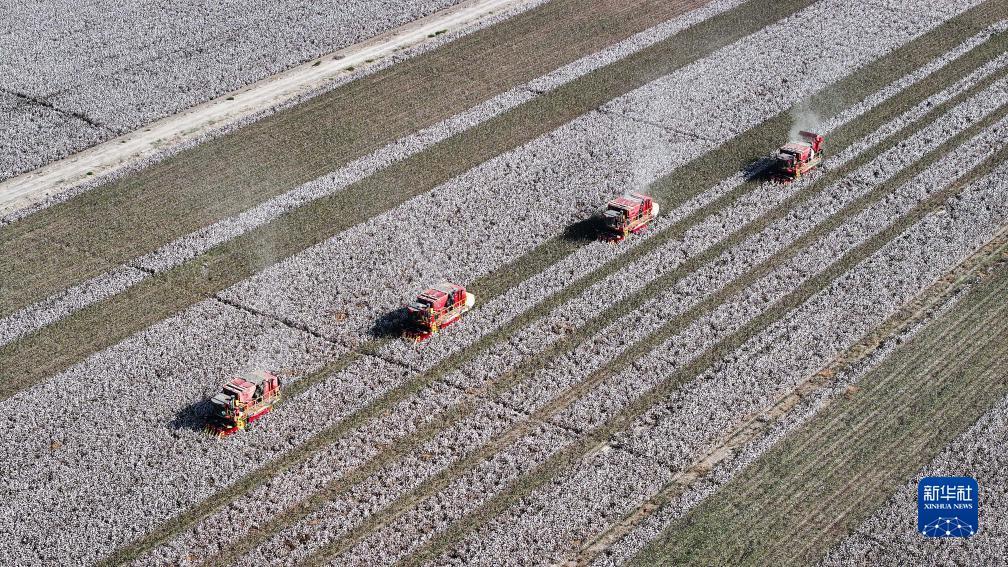 新疆库尔勒市普惠农场一处棉田,农民驾驶大型采棉机采摘棉花(10月12日摄,无人机照片)。