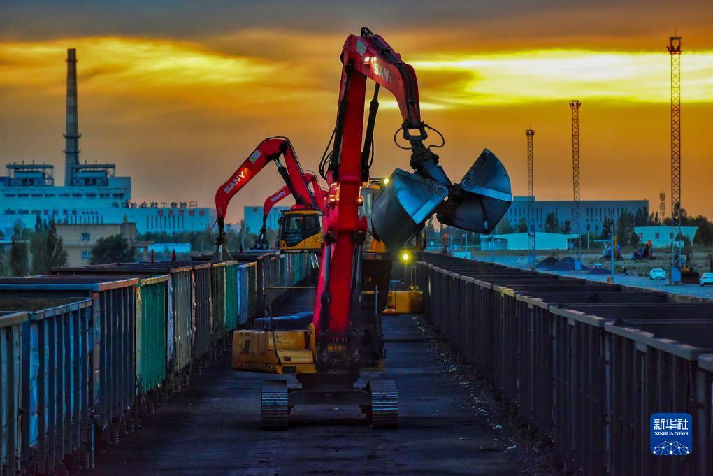 新疆霍尔果斯站换装库换十线抓料机对散堆装货物换装作业(9月6日摄)。目前,经霍尔果斯铁路口岸通行中欧(中亚)班列数量累计超过3.2万列,班列开行线路累计达80条,辐射境外18个国家、45个城市和地区。