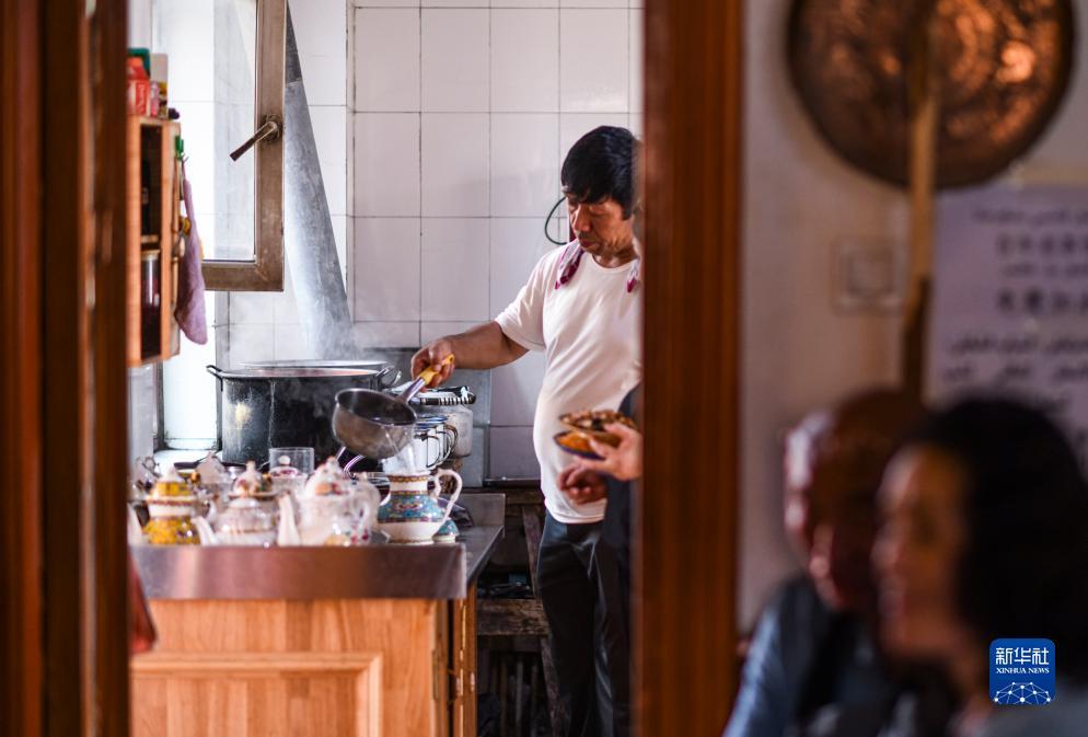 新疆喀什古城百年老茶馆内,工作人员往茶壶里加水(9月16日摄)。