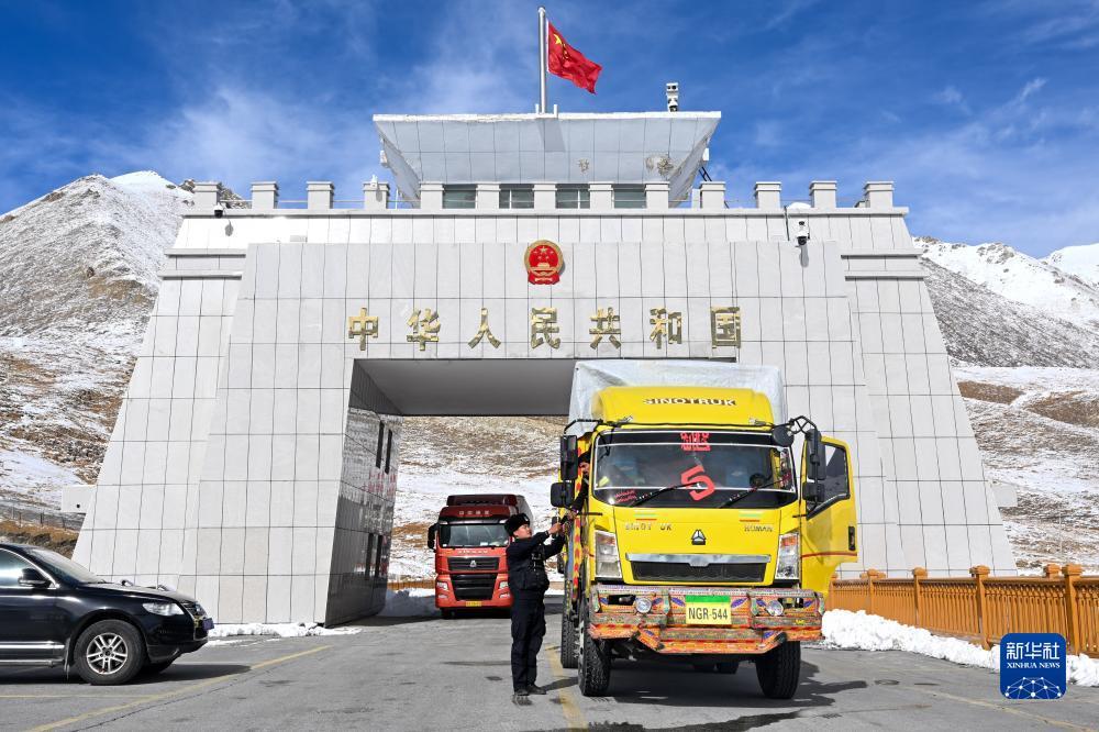 新疆出入境边防检查总站红其拉甫边检站民警在国门对入境车辆进行查验 (11月6日摄)。位于新疆喀什地区塔什库尔干塔吉克自治县的红其拉甫口岸,地处“中巴经济走廊”建设核心区,是“一带一路”重要桥头堡。