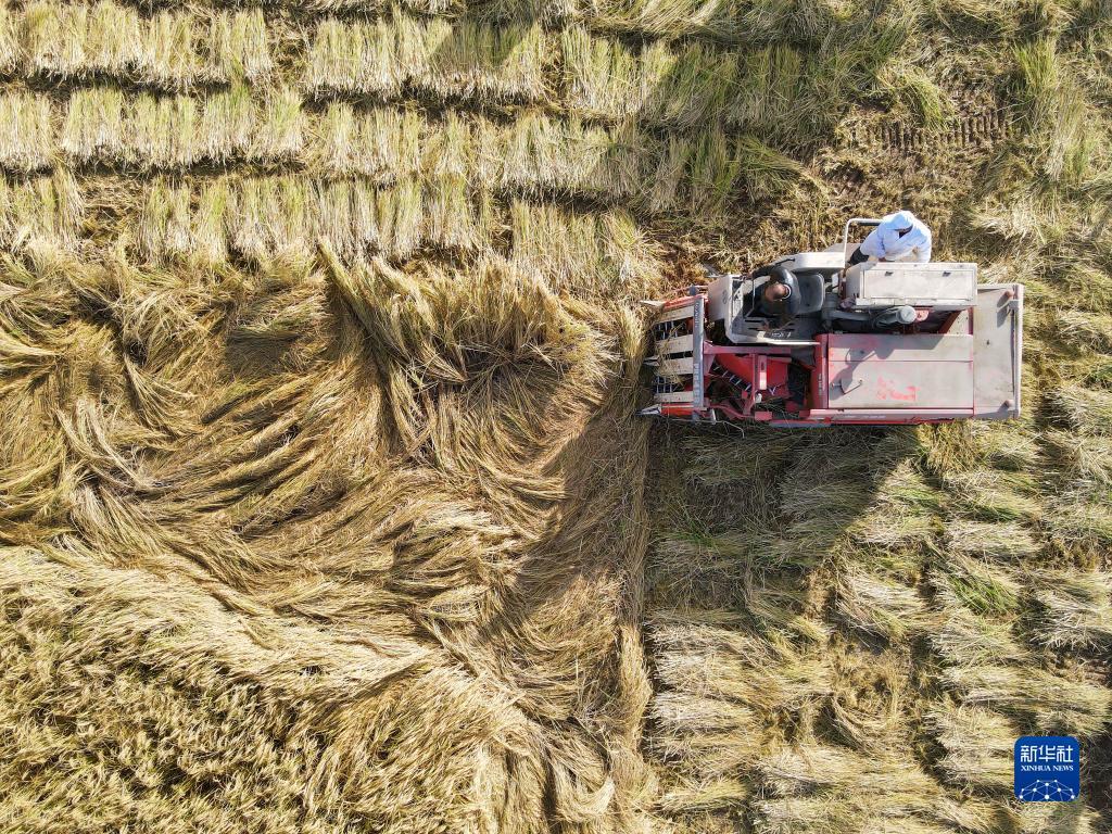 新疆阿拉尔市耐盐碱水稻测产田块,人们操作机械收割水稻(10月13日摄,无人机照片)。