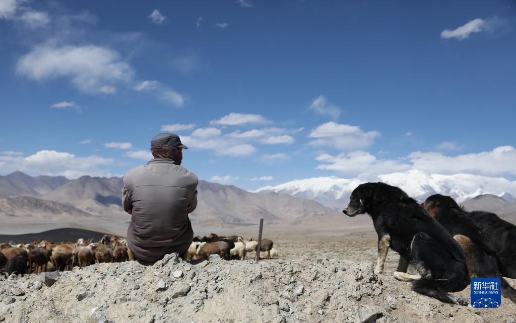 慕士塔格峰脚下,塔合曼乡萨热拉村牧民库尔班艾里·买达赛因与牧羊犬一起等待羊群吃草(9月6日摄)。