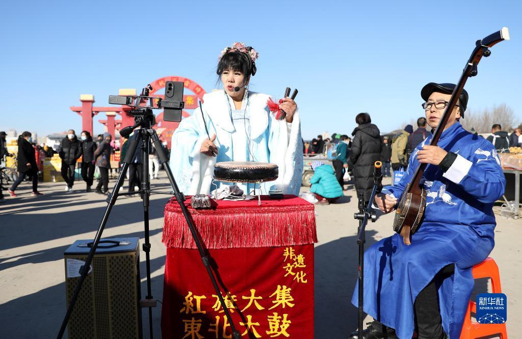 11月28日,东北大鼓非物质文化遗产传承人王艳娟(左)在红旗大集上表演。