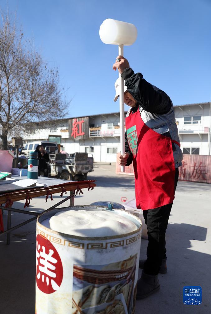 11月28日,一名商贩在红旗大集展示打糕。
