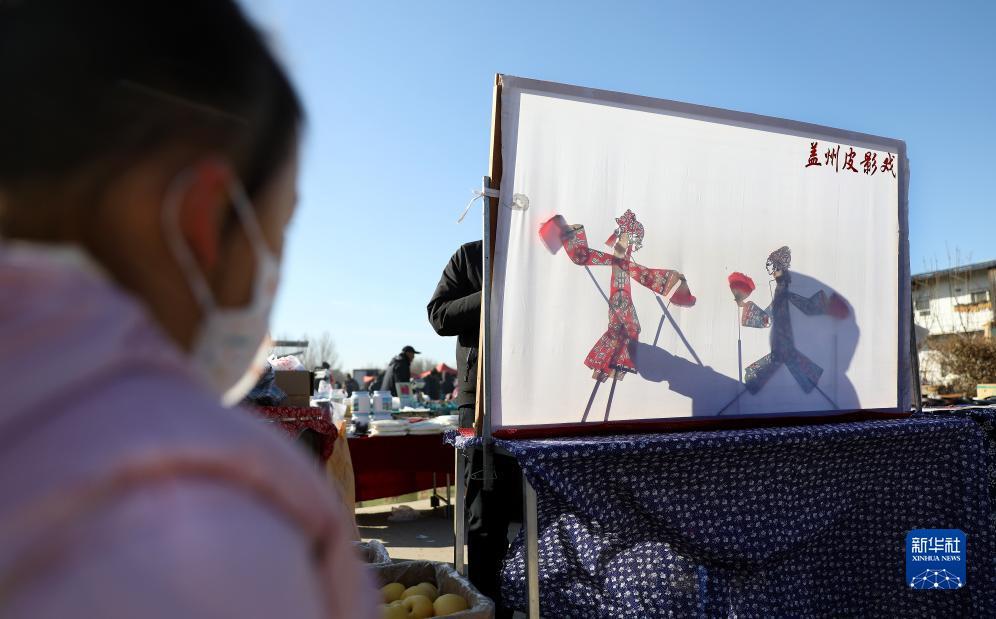 11月28日,一名小朋友在红旗大集上观看营口盖州皮影戏。