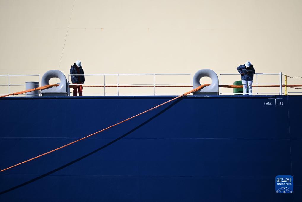 12月1日,工作人员为刚靠泊的“少林”号LNG运输船固定缆绳。