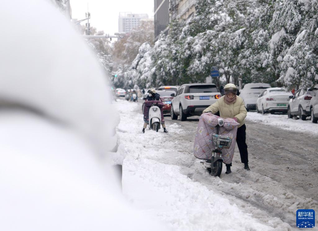 12月11日,市民在郑州市纬三路上推行电动自行车。