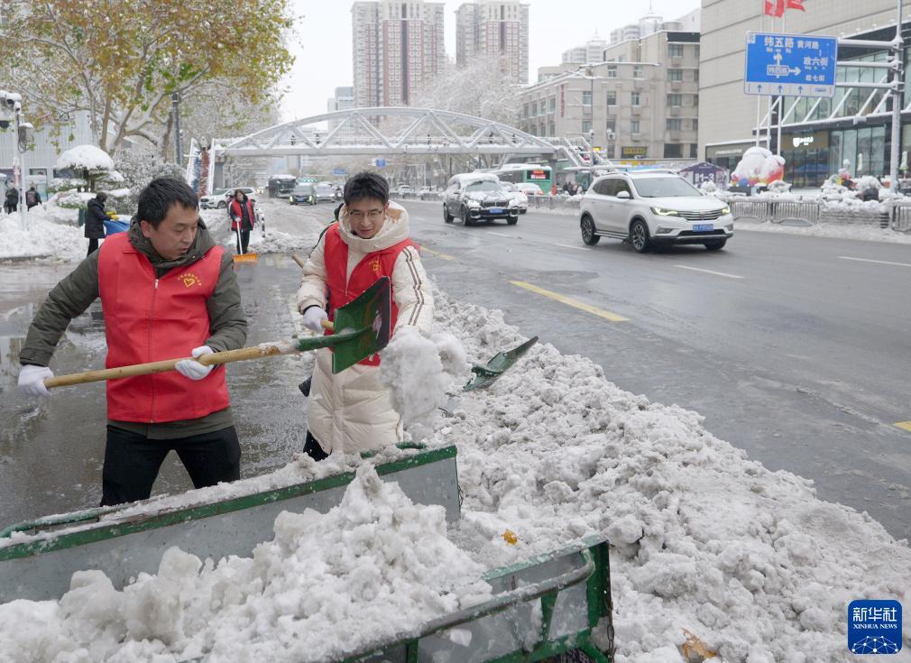 12月11日,在郑州市花园路街道,人们在清扫积雪。