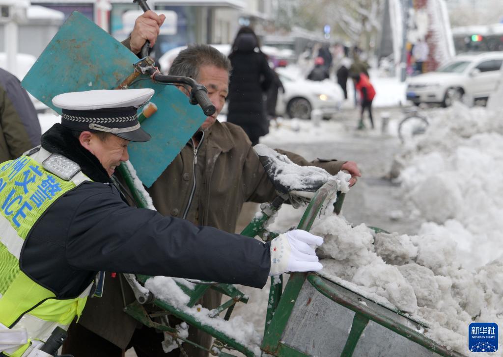 12月11日,在郑州市花园路上,交警和市民清除道路积雪。