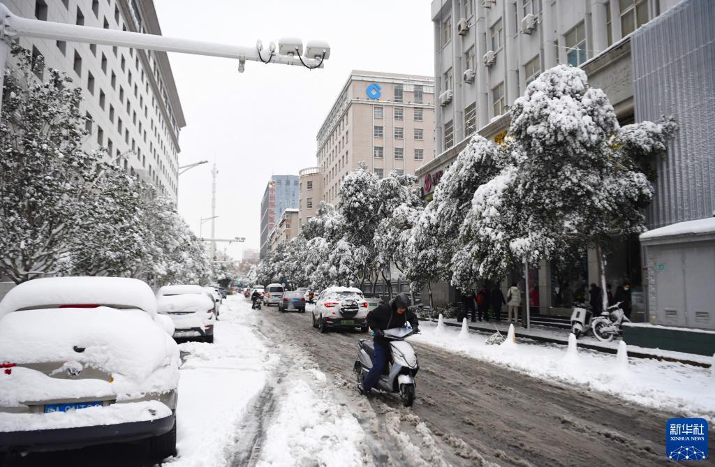 12月11日凌晨,市民在雪中骑行。