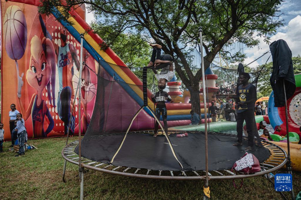 12月16日,市民在肯尼亚首都内罗毕乌胡鲁公园内体验蹦床项目。