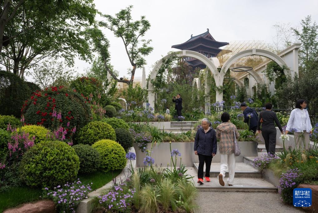 5月1日,游客在成都世园会主会场英国伊丽莎白花园里游览。