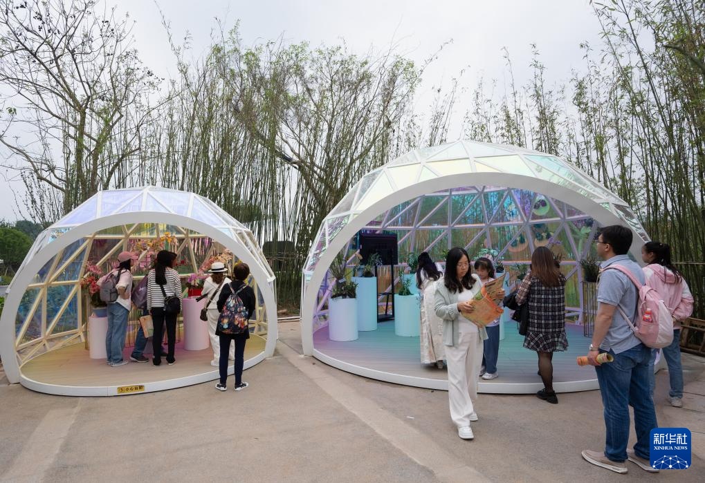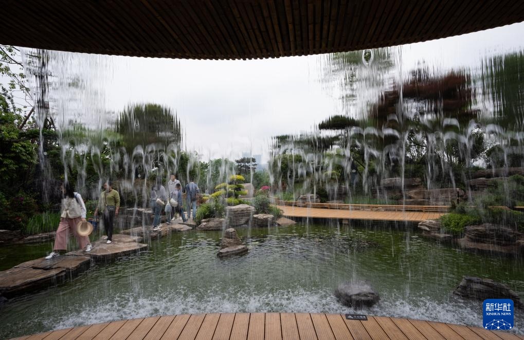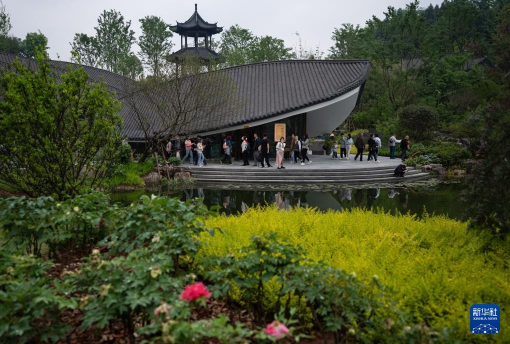 5月1日,游客在成都世园会主会场长沙园里游览。