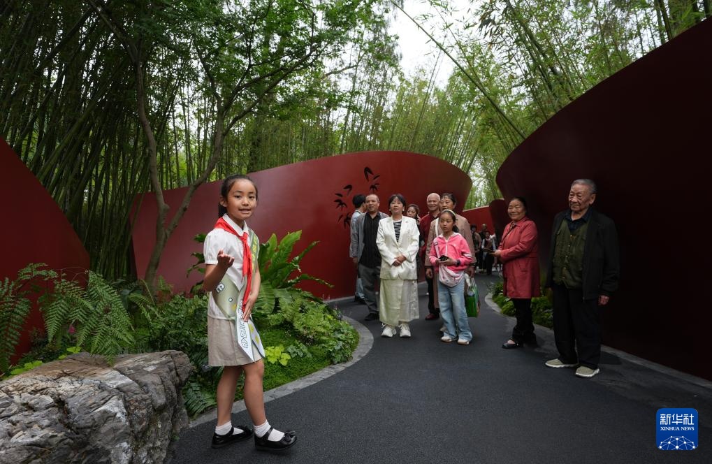 5月1日,在成都世园会主会场成都园竹影巷里,成都泡桐树小学(天府校区)9岁的刘昕依(左一)作为红领巾讲解员免费为游客讲解。