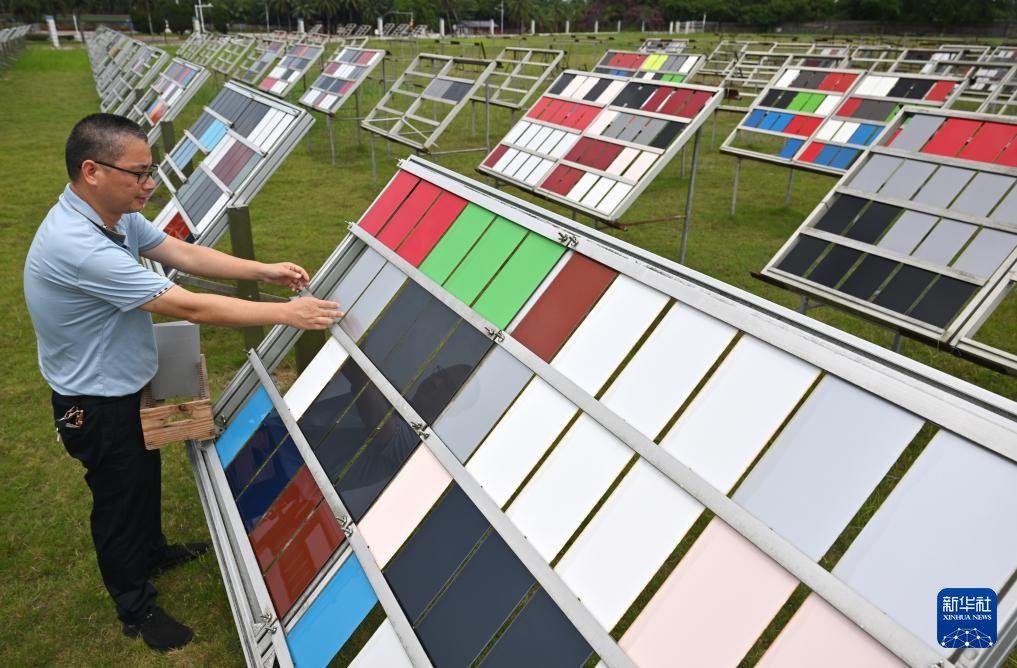 5月7日,工作人员对汽车油漆材料进行曝晒试验。