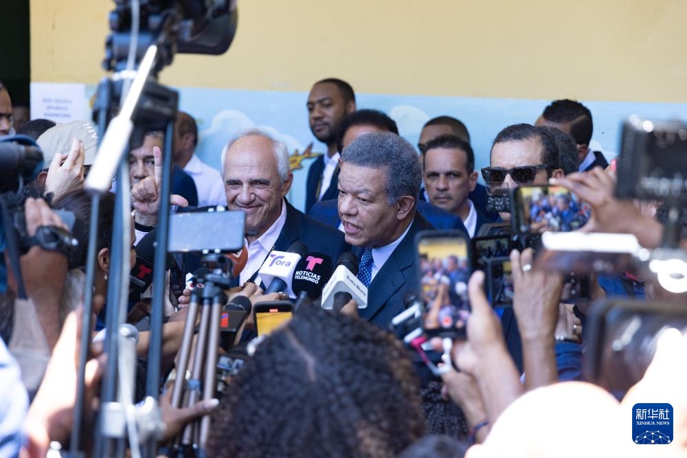 5月19日,在多米尼加首都圣多明各,前总统、人民力量党候选人莱昂内尔·费尔南德斯(中右)在一处投票站投票后发表讲话。