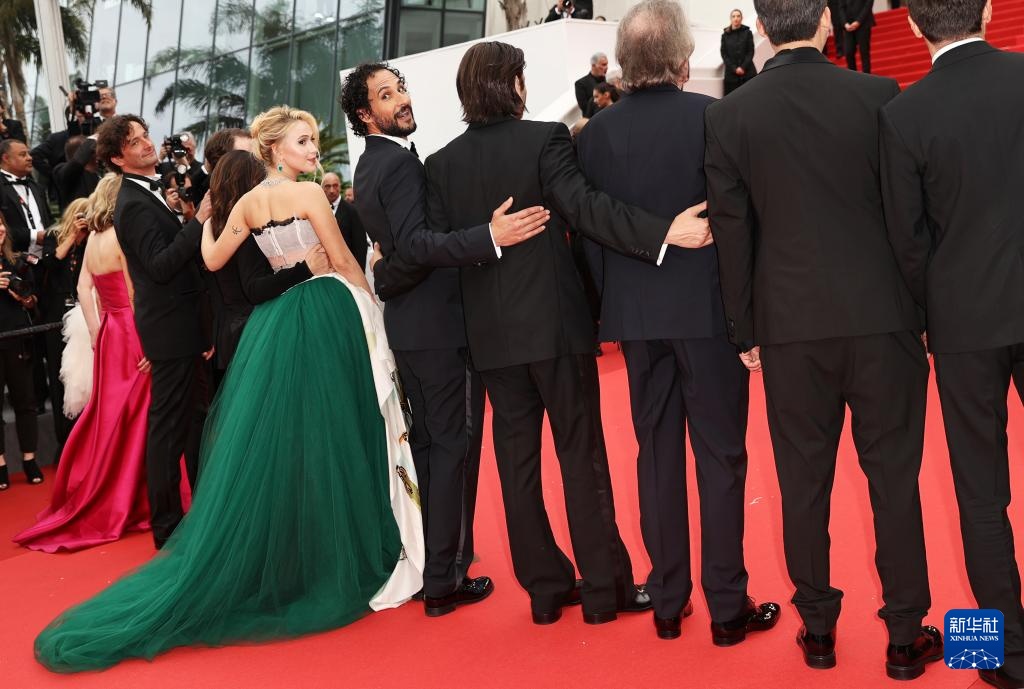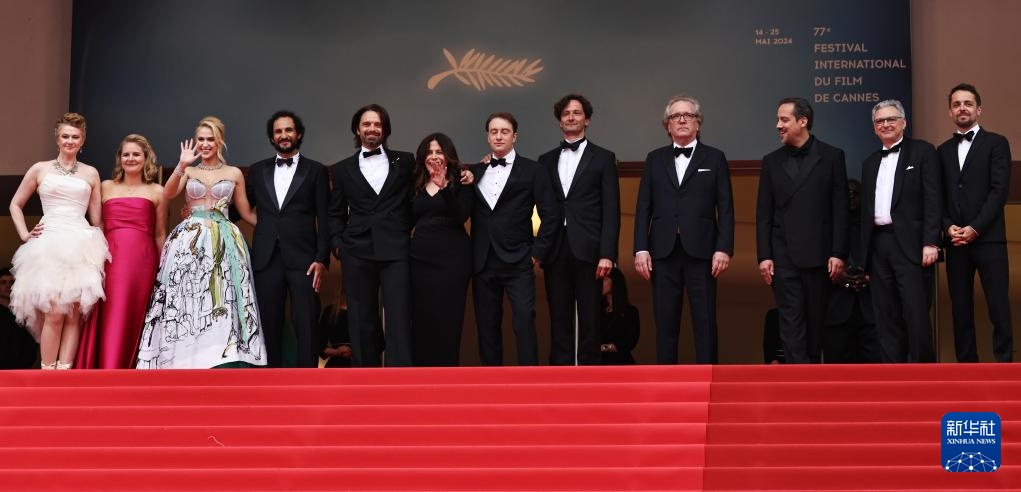 5月20日,在法国南部小城戛纳举行的第77届戛纳国际电影节上,导演阿里·阿巴西(右五)携主创人员抵达主竞赛单元影片《飞黄腾达》的首映礼红毯。
