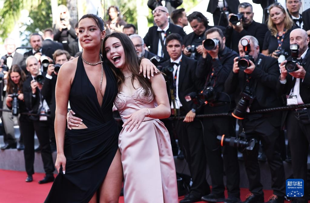5月23日,在法国南部小城戛纳举行的第77届戛纳国际电影节上,主竞赛单元影片《狂爱》的主演阿黛尔·埃克萨霍普洛斯(左)和马洛丽·瓦奈斯克踏上首映式红毯。