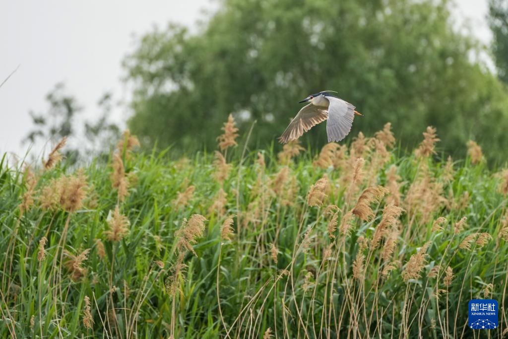 6月4日,野生鸟类在东平湖野生动物栖息地内飞翔。东平湖是候鸟越冬栖息地,有珍稀鸟类30多种。
