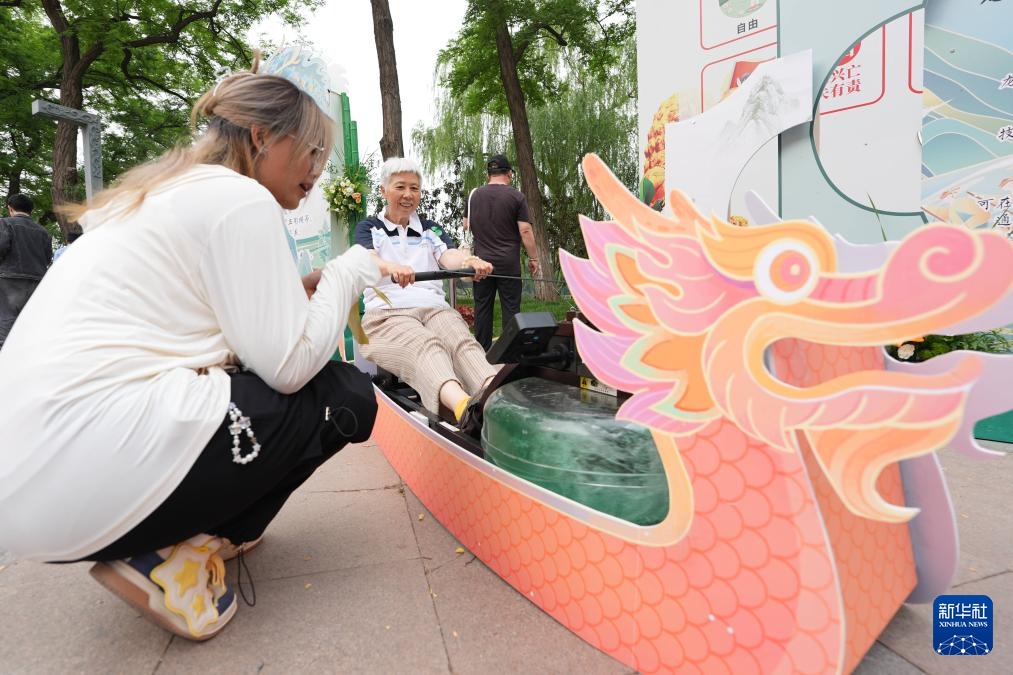 6月5日,游客在2024龙潭端午文化节活动上体验“划龙舟”。