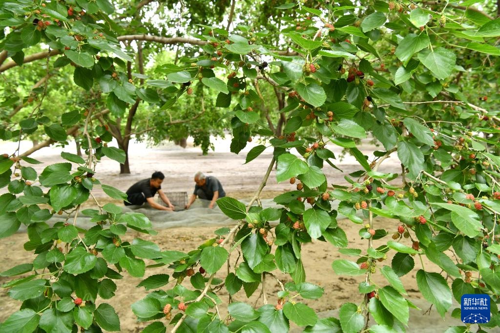 6月6日,河北沧州泊头市营子镇农民在收获桑葚。