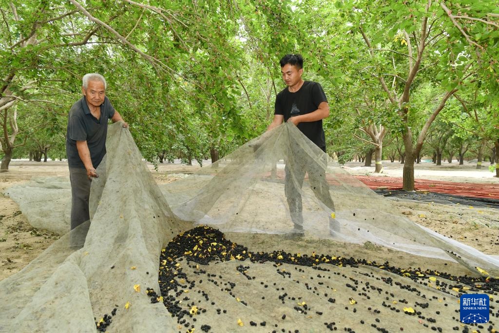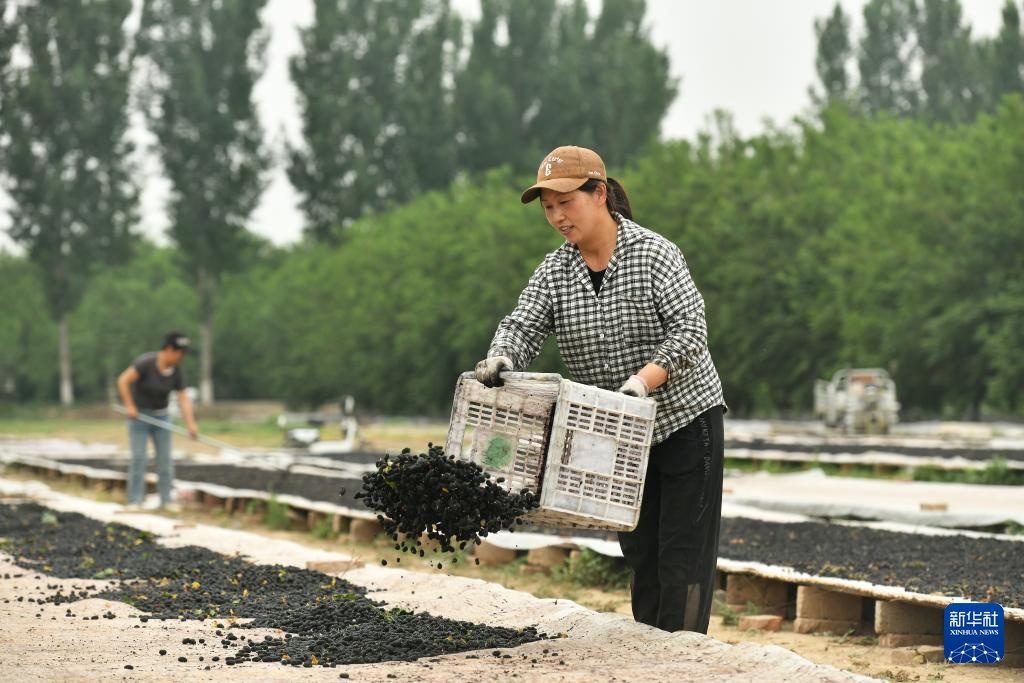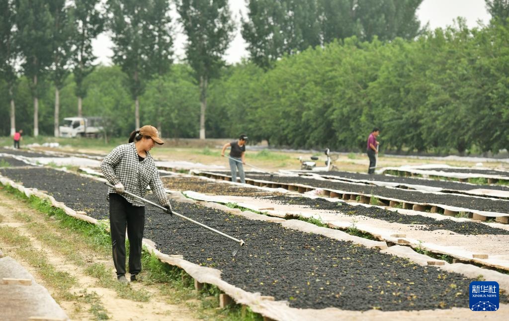 6月6日,河北沧州泊头市营子镇苟鲁道村农民在晾晒桑葚。