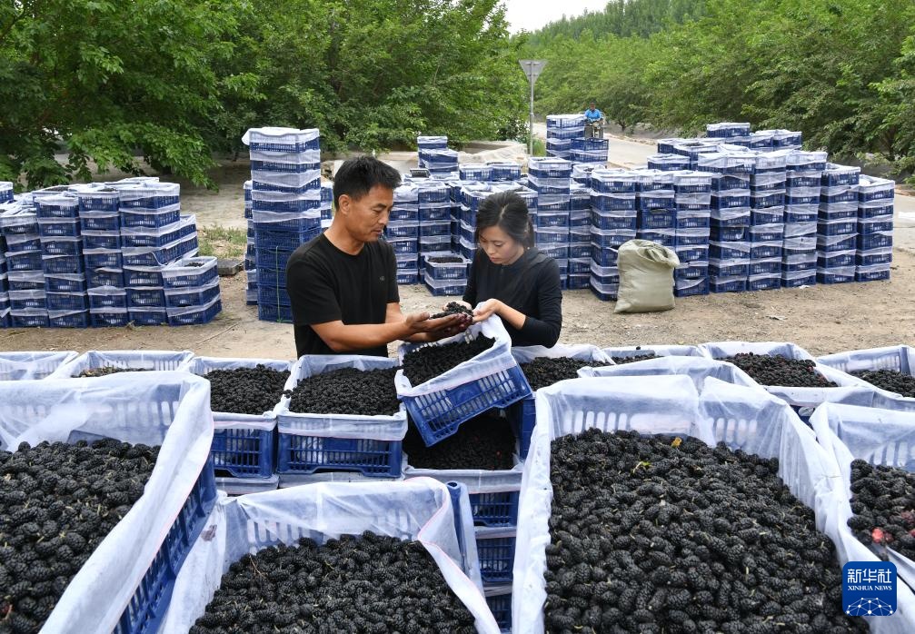 6月6日,在河北沧州泊头市营子镇苟鲁道村,收购商在查验桑葚质量。