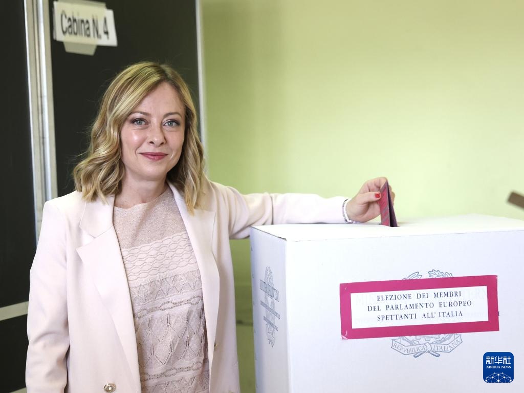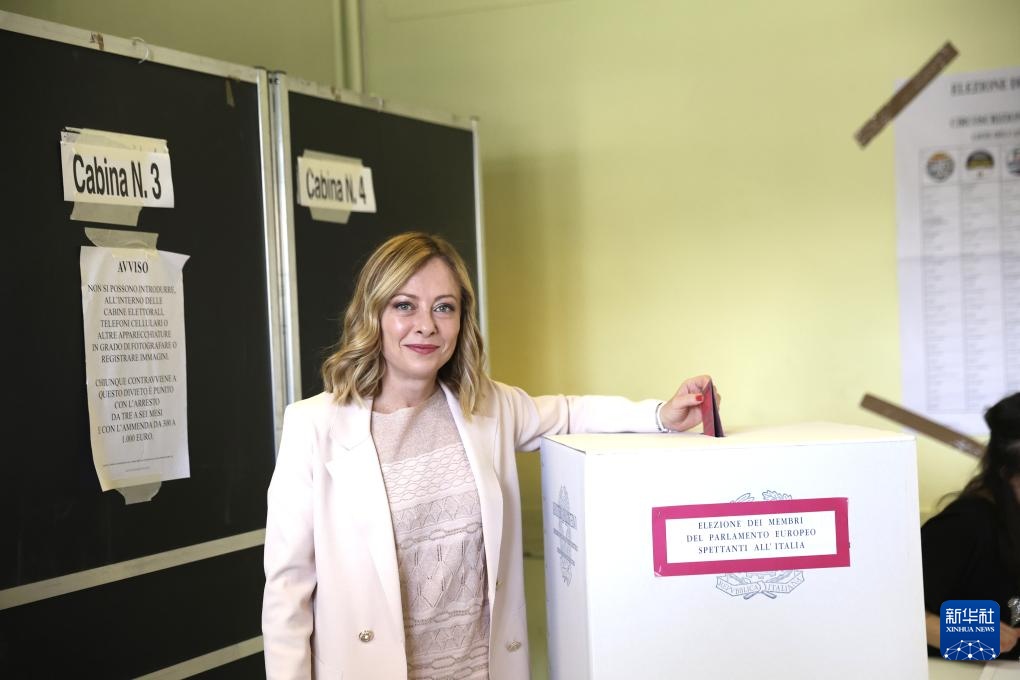 6月8日,意大利总理梅洛尼在意大利罗马一处投票站投票。