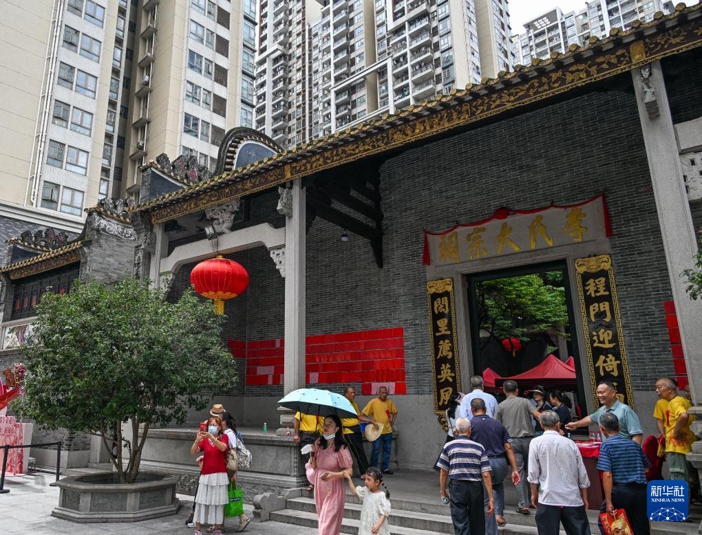 6月10日,猎德村李氏大祠堂摆满龙船饭,主家在祠堂门口热情迎客。“龙船景”期间,村民会以龙船饭招待来客。