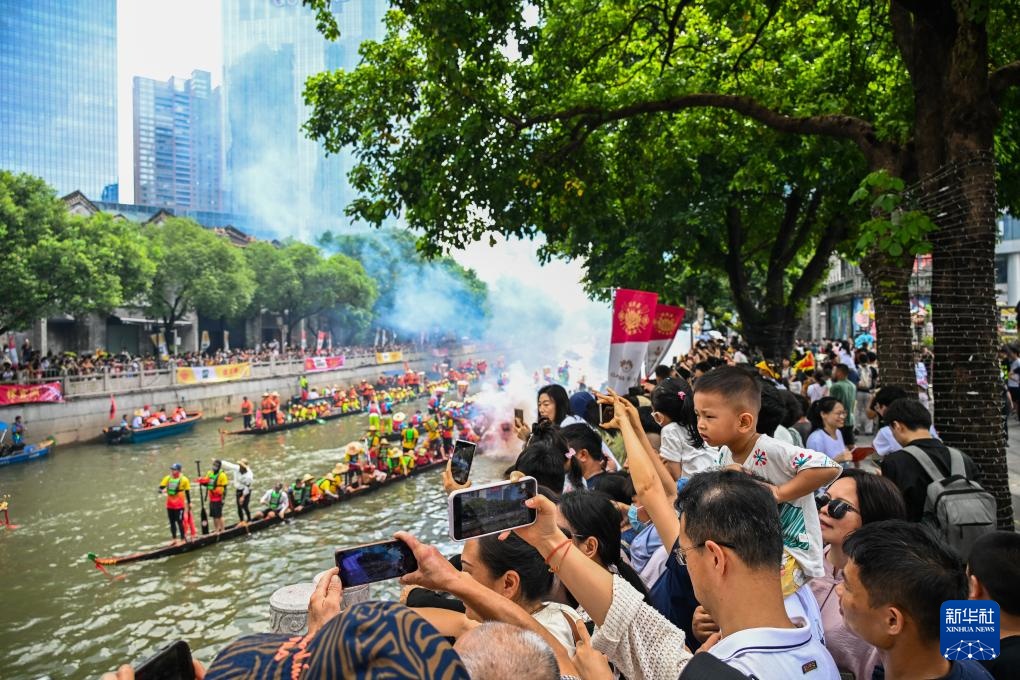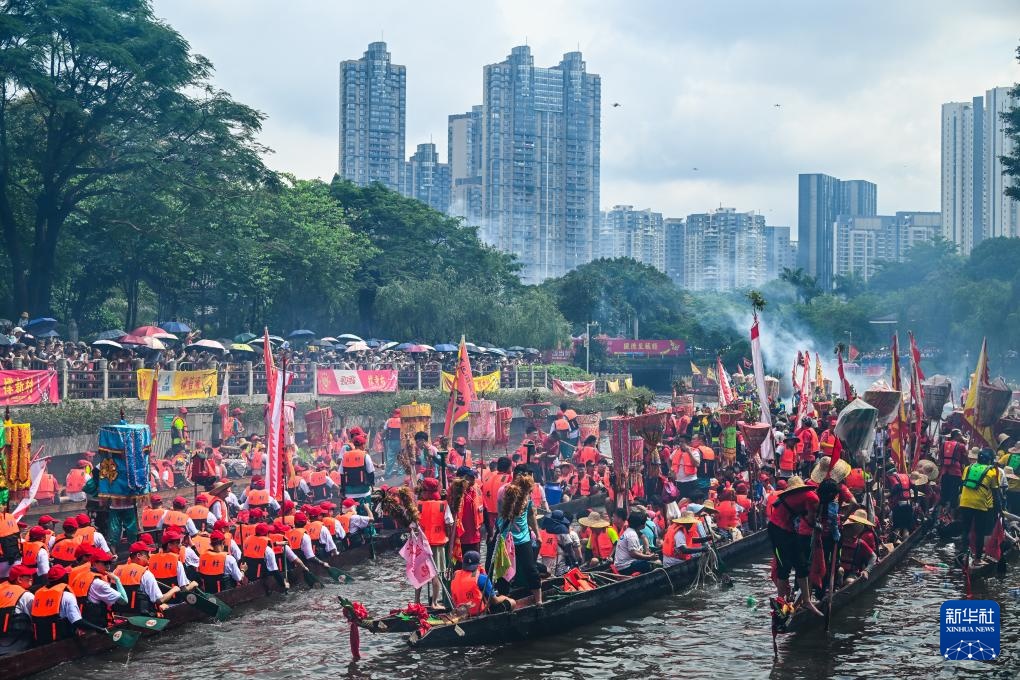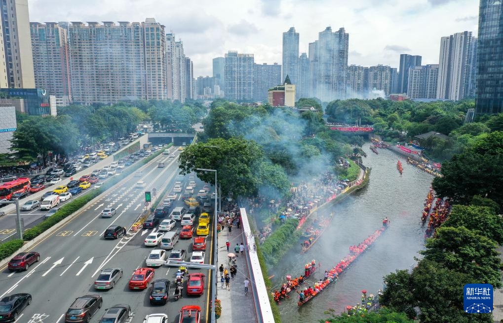 6月10日,猎德村热闹的传统龙舟“龙船景”与繁忙的现代都市交汇相融(无人机照片)。“龙船景”是广府地区水乡在端午期间举办的一种民俗活动。