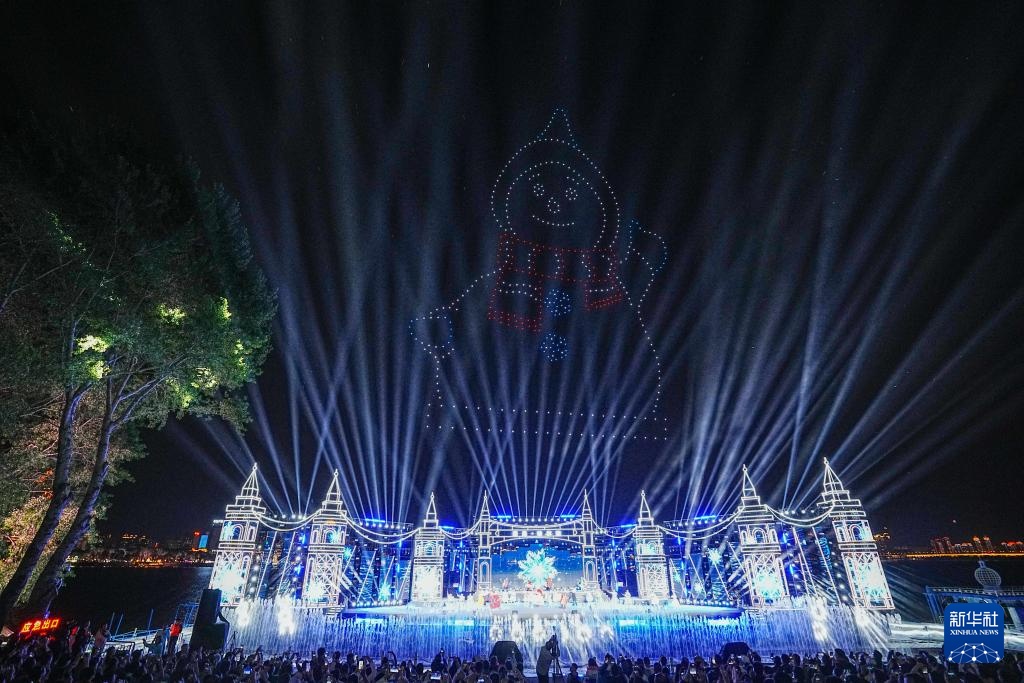 6月10日,观众在观看《遇见·哈尔滨》演出现场上空的无人机表演。