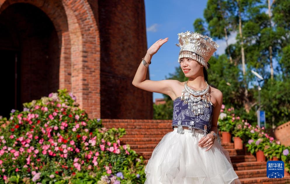 6月13日,游客身着特色服饰在东风韵小镇里拍照留影。