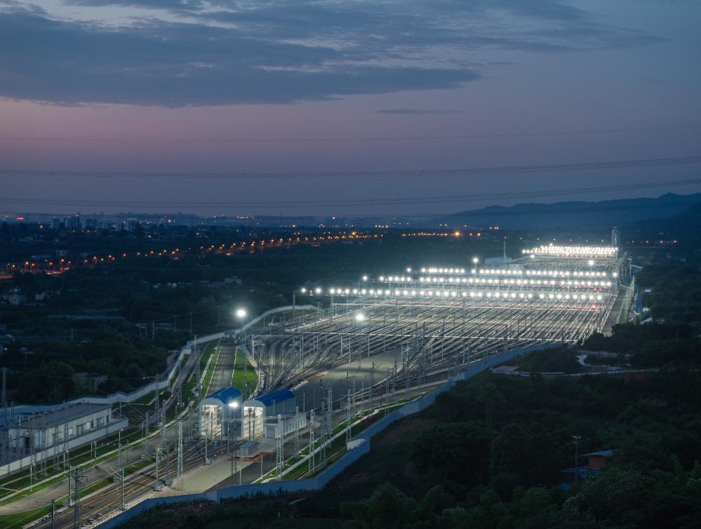夜色中的天府动车所(6月11日摄,无人机照片)。