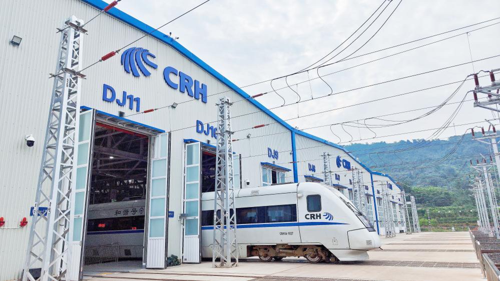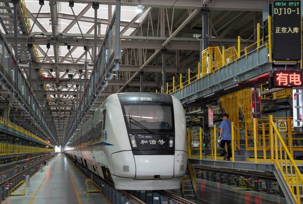 6月14日,一列动车驶入天府动车所检修库等待检修。