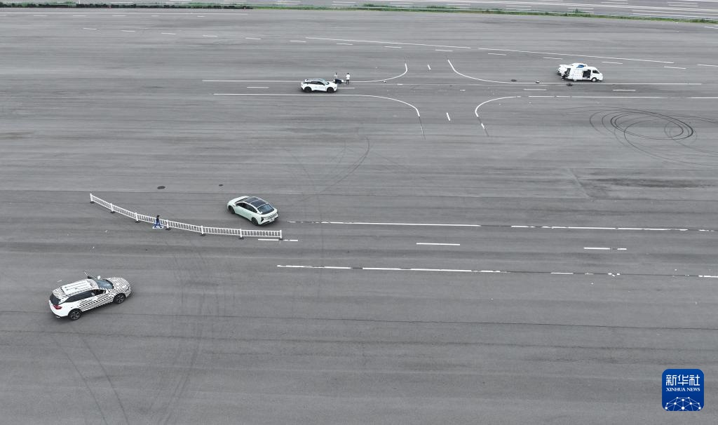 6月14日,智能网联测试车辆在天津(西青)国家级车联网先导区封闭测试场内进行自动驾驶主动安全功能测试(无人机照片)。