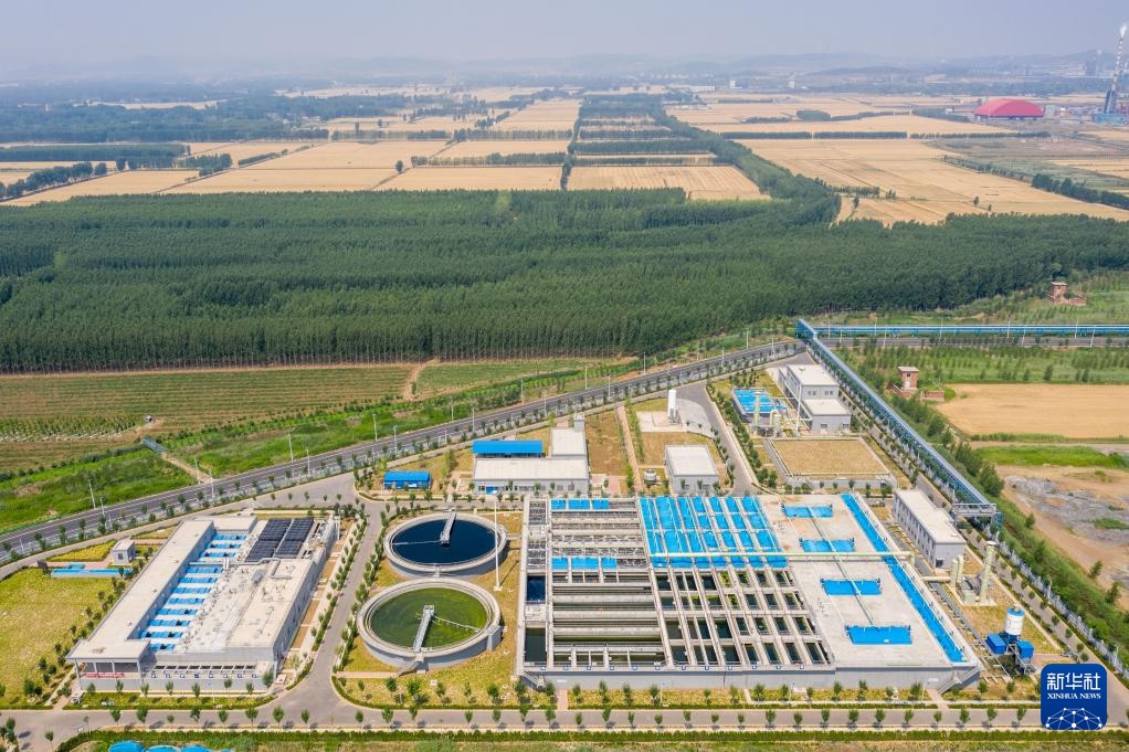 6月20日,肥城市化工产业园工业污水处理厂日净化2万吨水补充附近村庄灌溉用水(无人机照片)。