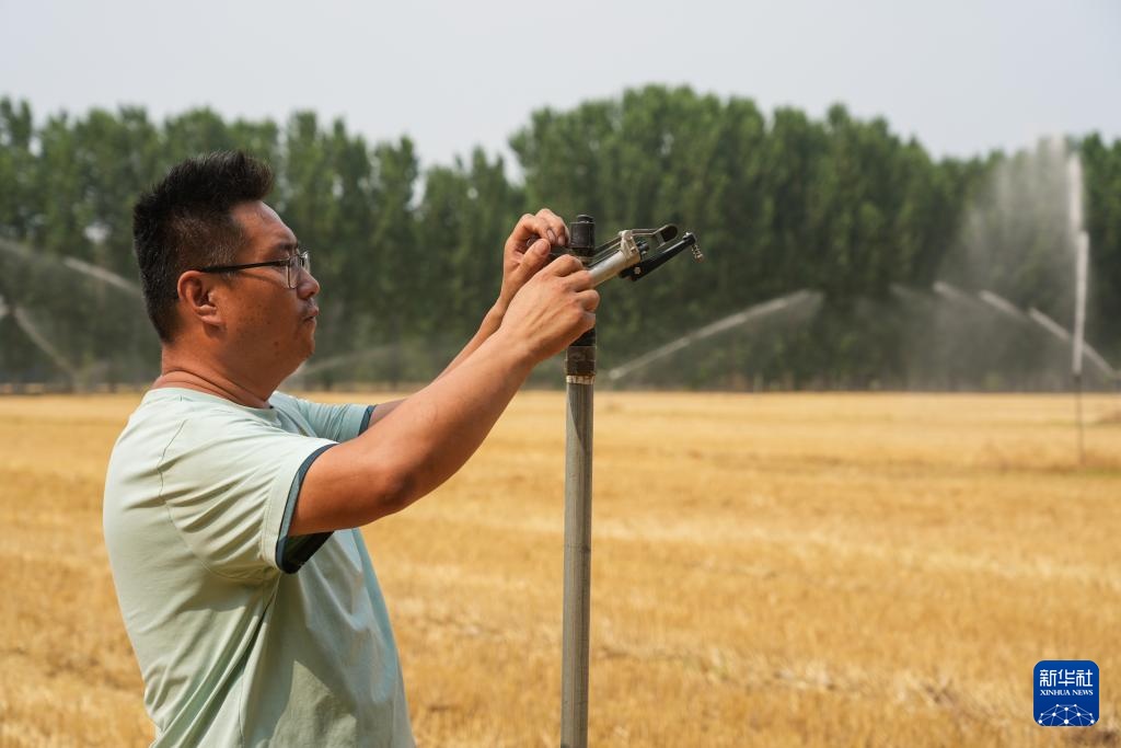 6月20日,肥城市石横镇汇鑫源农民专业合作社负责人赵再贺在合作社流转土地检查节水喷灌设备。